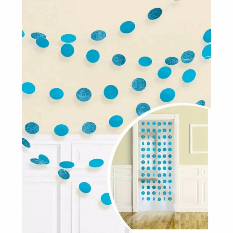 Add some glitz and glam to your decor with blue Polka Dot String Decorations. These blue polka dot decorations feature round, double-sided blue cutouts strung along an invisible plastic string. Half of the polka dots are blue and the other half are covered in blue glitter. At 7ft long, these blue string decorations can be hung vertically in an entryway or doorway or draped horizontally across mantels and walls!