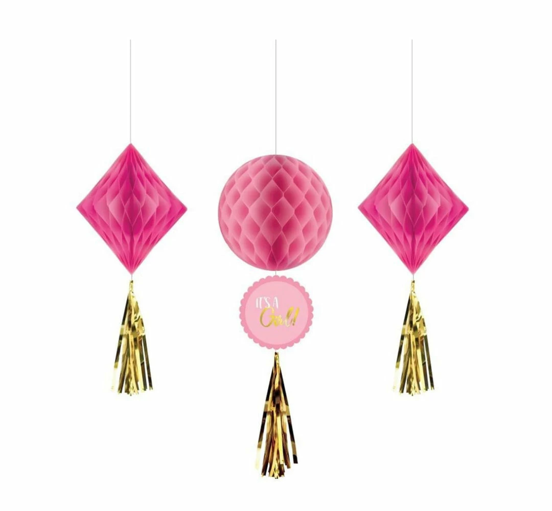 - & one pink cylinder honeycomb decoration with gold plastic tassels and a sign that reads “It’s A Girl!”