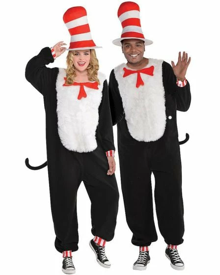 Make sure you leave enough time to create some rhymes when you dress in this Cat in the Hat costume. This black and white jumpsuit features a red bow at the neck and comes complete with oversized red and white top hat and tail
