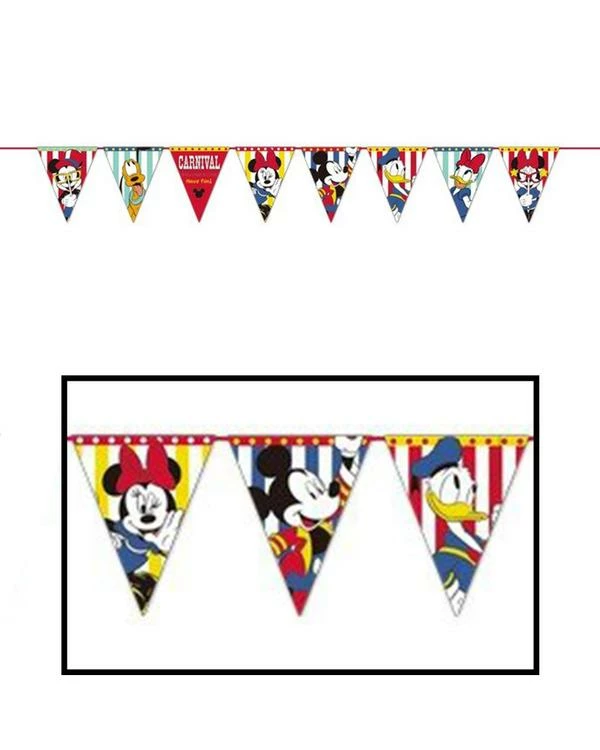 This banner is 2.4m long with 8 pennants which measure at 23cm. Each pennant includes the whole gang, Mickey, Minnie, Pluto, Daisy and Daffy.