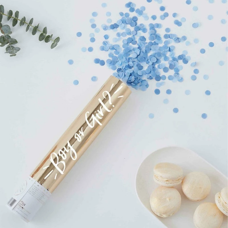 a pink confetti explosion. There is a pink sticker on the cannon to identify the pink confetti inside. Remove the sticker before your guests arrive to keep the gender a mystery!Each pack contains 1 confetti cannon measuring 30cm (H) by 4.5cm (W).