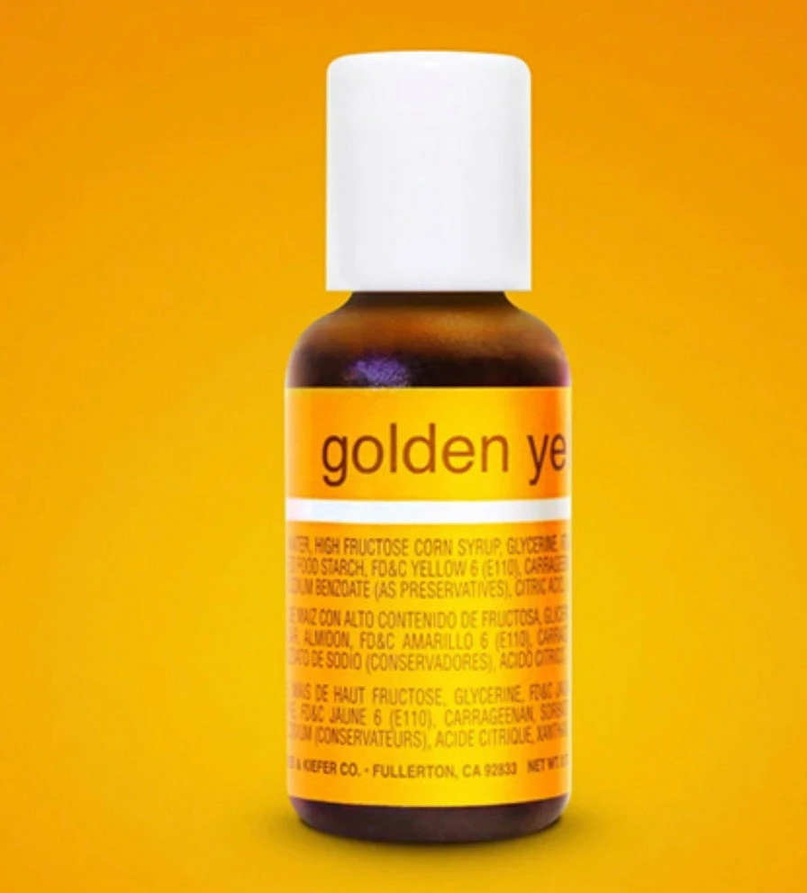 This Chefmaster Liqua-Gel Golden Yellow is a highly concentrated, vibrant food colouring that mix easily and provide consistent tones without altering the texturing of your product. Colours are intense, bright and vivid. Easy to mix and disperse instantly. Gels come in 0.7oz (20ml) squeeze bottle with twist-top lids, so you can add drops for easy-to-repeat colors every time. Use in whipped icing, buttercream, fondant, cookies, and more.