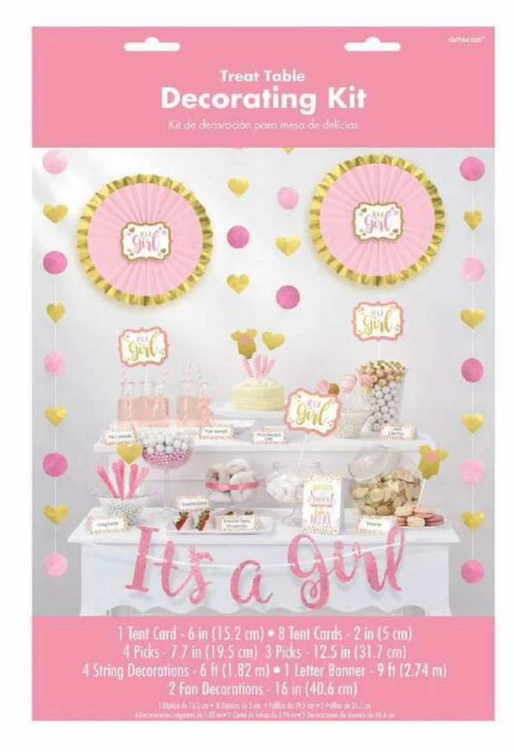 Set up the perfect baby shower with the Amscan Baby Shower Pink Buffet Decorating Kit. Make your home or venue beautiful, pink and inviting, using the letter banner, tent cards, picks, and string and fan decorations.Â