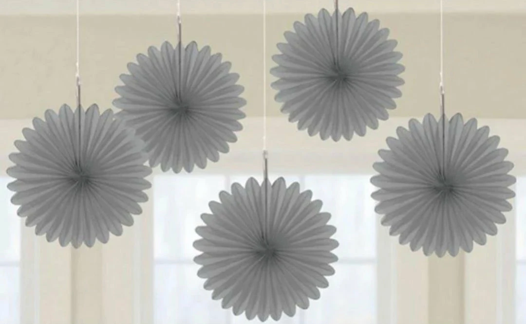 Leave an Impression our Silver Mini Paper Fan decorations to create a dazzling display for any party or event. Each pack includes 5 Mini Fans measuring 6in wide and includes string for hanging and are simple to assemble. Arrange fans of a single colour or mix and match from our available range with the options of light and dark shades.