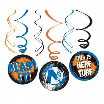 3 x double-sided hanging swirl decorations measuring approx. 97cm long. Round slogan/target cutouts measure 15cm in diameter.