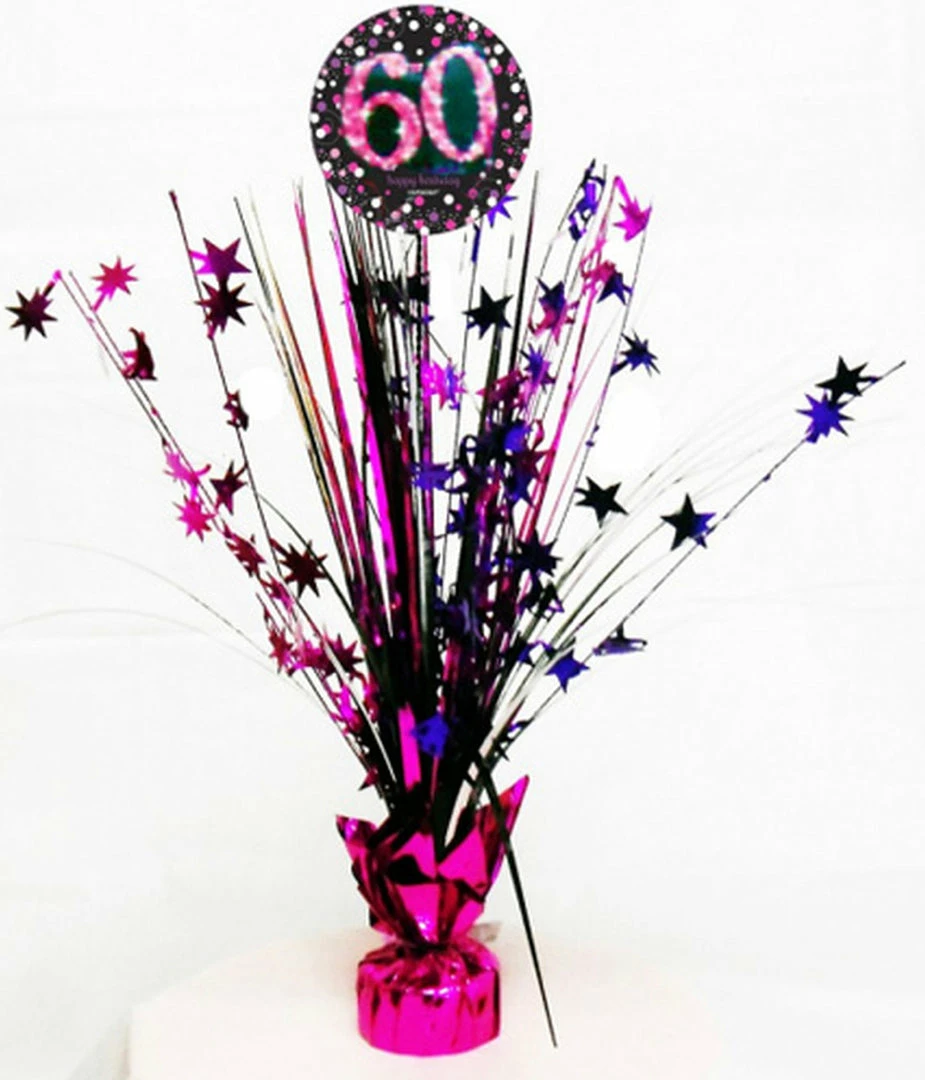 Pink 60th birthday foil spray centrepiece.