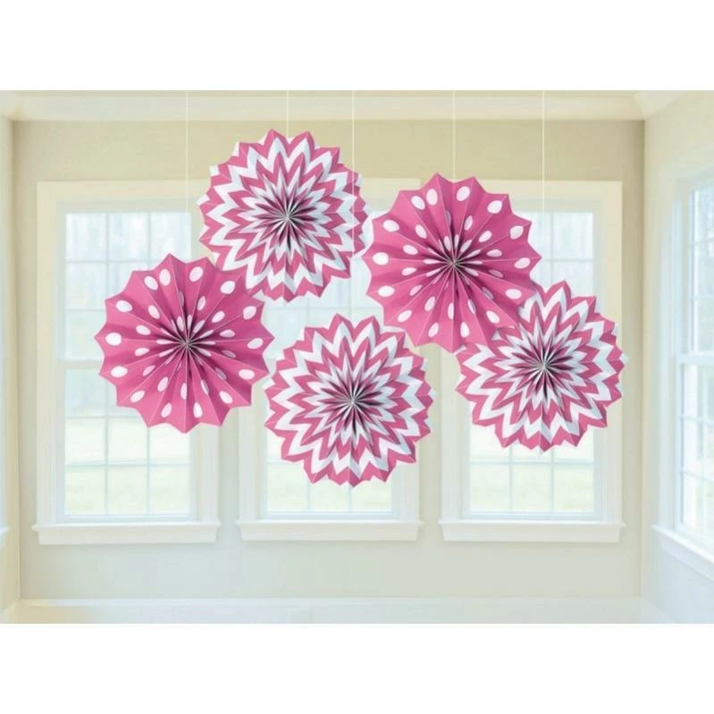 If you’re a lover of pink, then how about hanging this Bright Pink Hanging Printed Fan Decorations Pack of 5 up on the ceiling with your other decorations. These fans come in a pack of 5 and features two round pink fans with white polka dots and three round fans with pink and white stripes. Combine with our range of Bright Pink party supplies including party cups, party plates, tablecovers and more.
