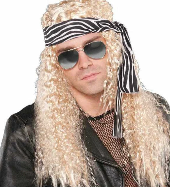 Our Rock Star Wig features long curly blonde hair that sits below the shoulder accompanied by a black bandana. One size fits most Teens and Adults. Wig Cap recommended which sold separately.