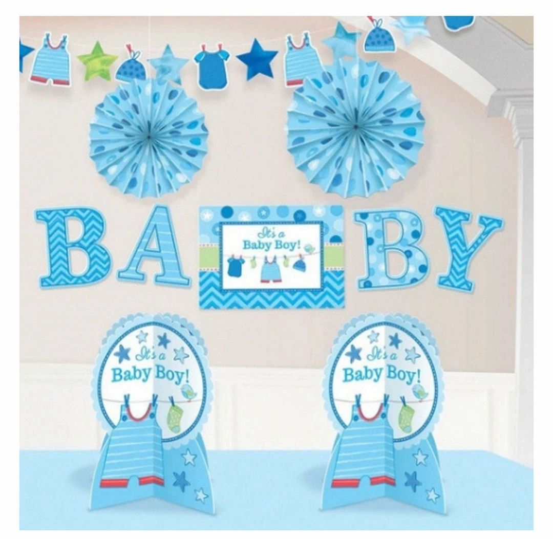 Celebrate your beautiful baby boy’s upcoming arrival with this complete Baby Shower room decorating kit. Contains all you need to deck out your room in bold blue. Featuring super cute imagery of baby boys clothing on a clothes line