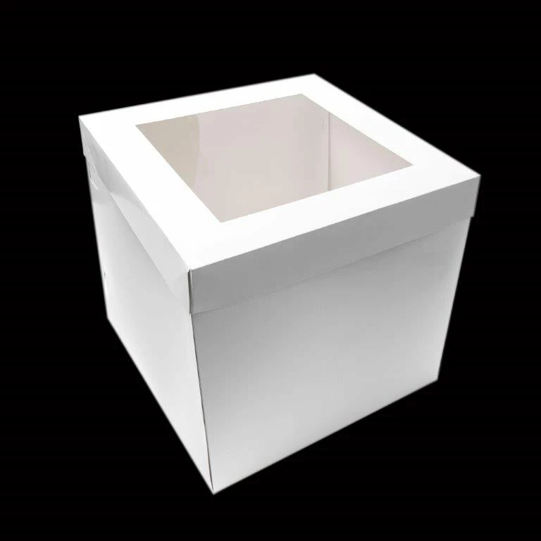 These original designed tall cake boxes are made from high quality white milkboard and come in 2 pieces. A lid with WINDOW and the base, that allows for opening on the side to slip the cakes out.